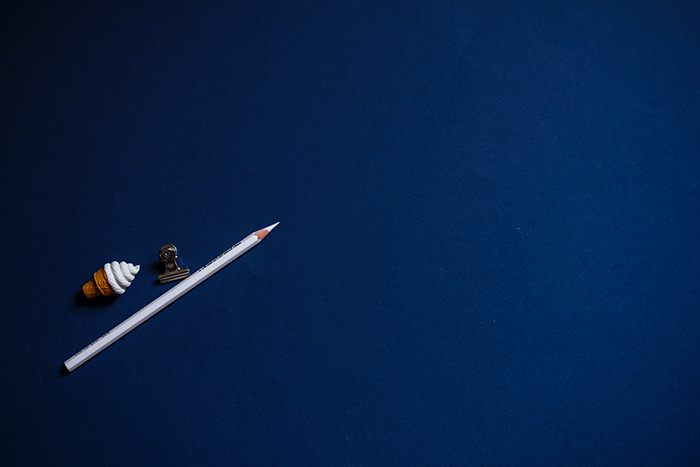 A dark blue background with a colored pencil, a clip, and a tiny ice cream cone!
